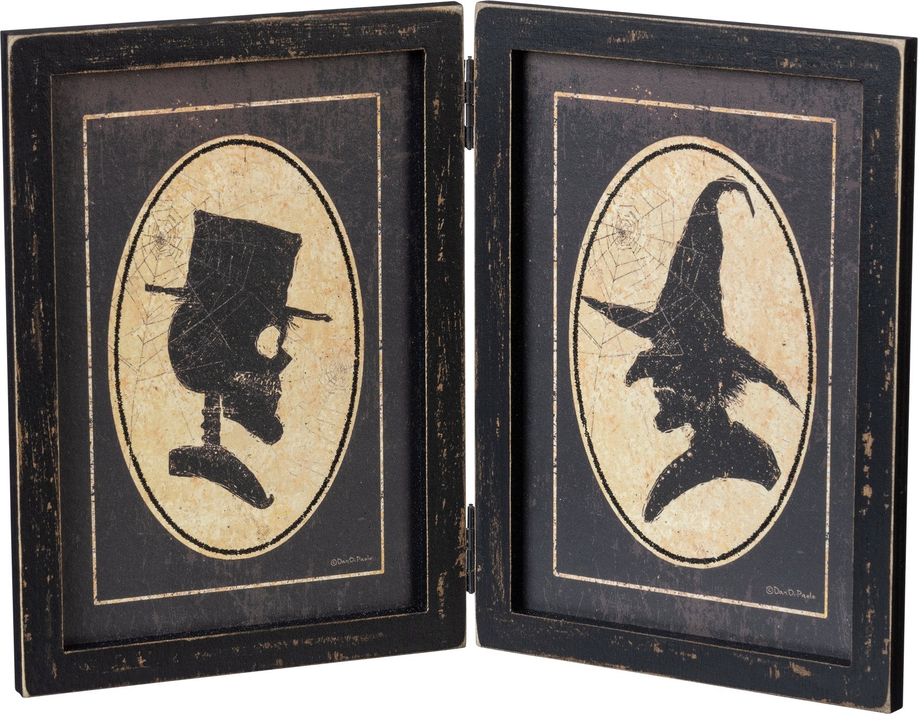 Add a touch of vintage charm to your Halloween décor with this Skeleton & Witch Portraits Hinged Sign by artist Dan DiPaolo.